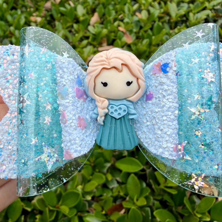 The Ice and Snow Bow is four inches long and it is has a princess embellishment in the center.